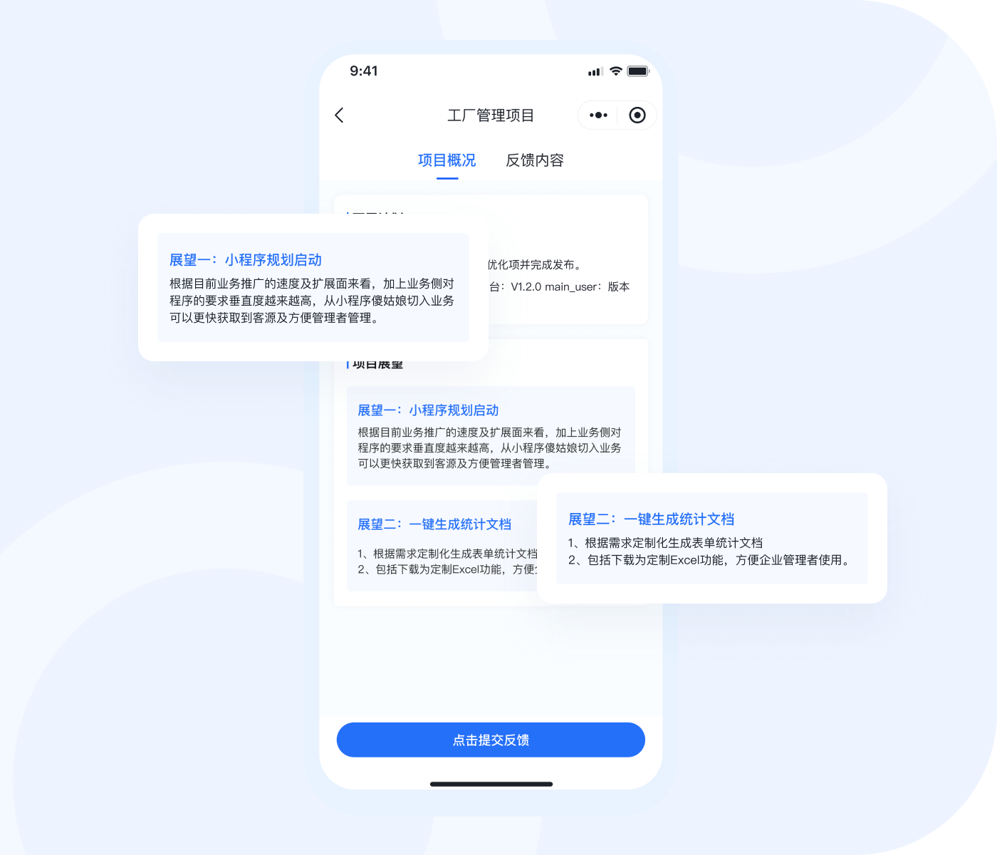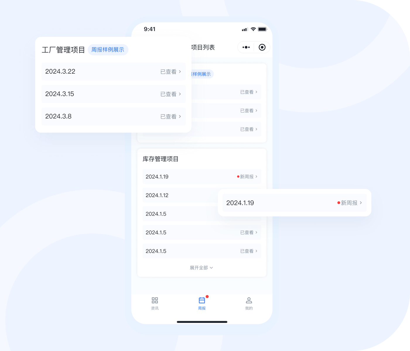 功能包含行业资讯、AI助手、项目周报,助力提升工作效率。